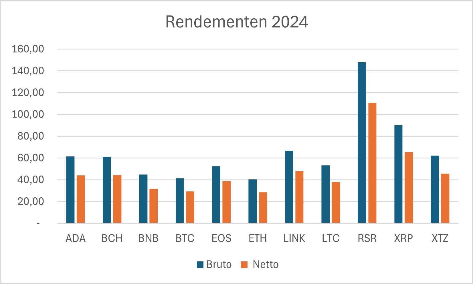 De staafdiagram toont de resultaten van de tradersoftware in 2024. De verticale kolom is het rendementspercentage. Blauw is het bruto-rendement (rendement voor aftrek van transactiekosten en commissie). Oranje is het netto-rendement.