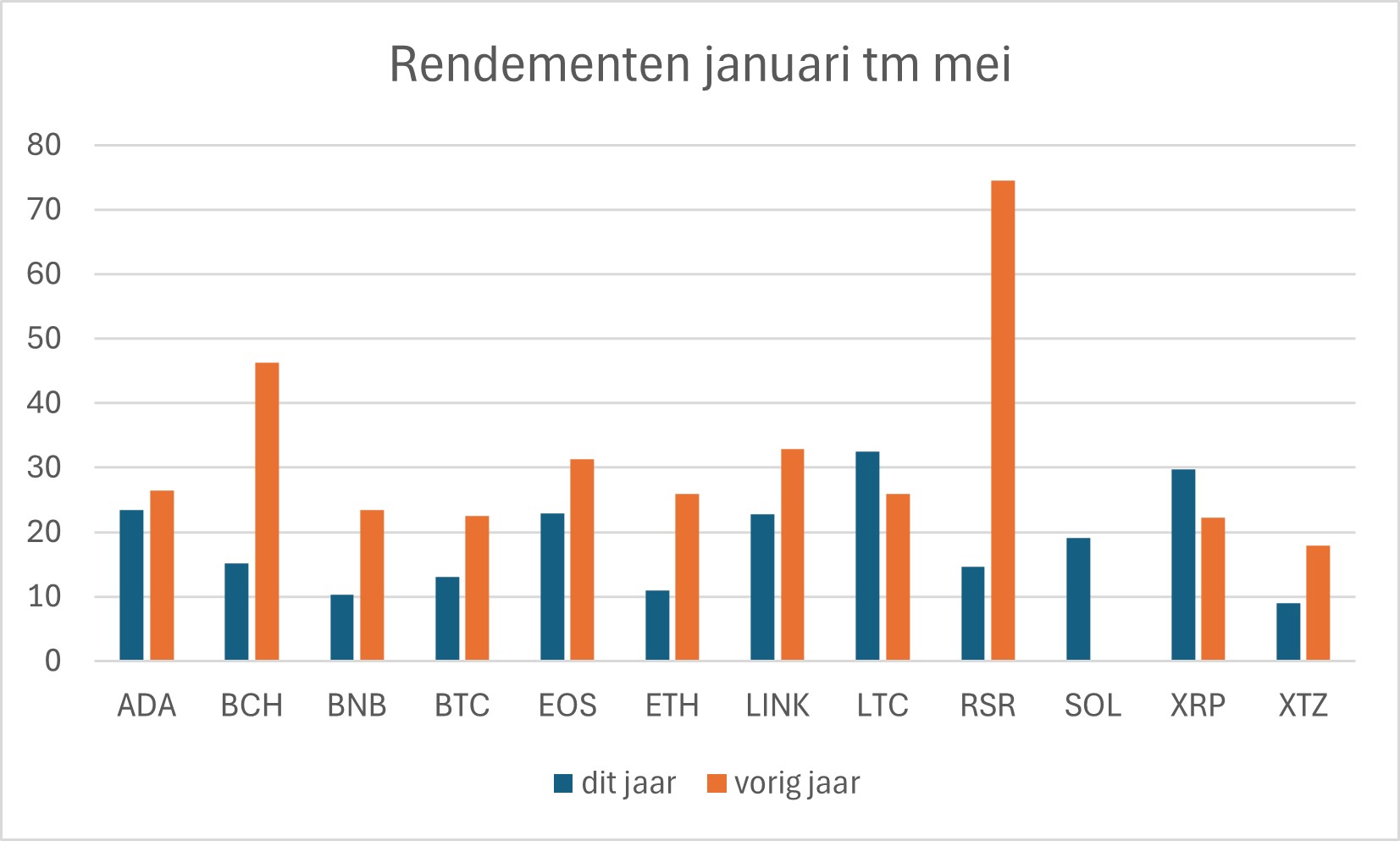 De staafdiagram toont de resultaten van de tradersoftware in 2025 t.o.v. dezelfde periode in 2024. De verticale kolom is het rendementspercentage. Blauw is 2025 en oranje is 2024. Beide rendementen zijn bruto (voor aftrek transactiekosten en commissie).